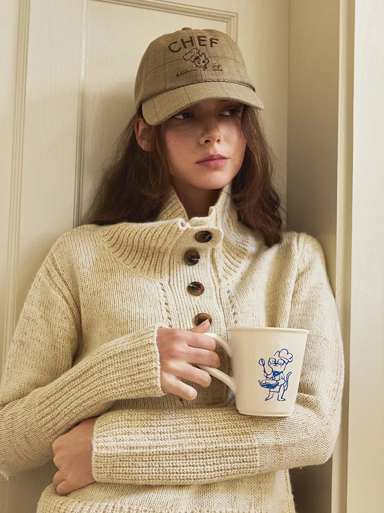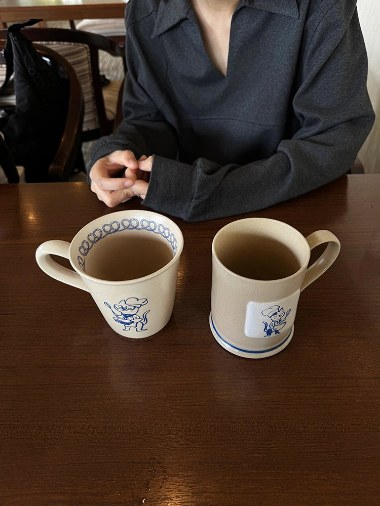 Copy: Within the aroma of coffee and the scent of baking butter at “La Fourchette et le Chat” (Silver Fork and Cat), the proprietors are a pair of charming feline chef brothers—Cat Brother and Cat Little Brother. Cat Brother serves as the restaurant's executive chef, meticulous and composed, clad in a crisp, pure-white chef's uniform. His signature Wellington steak, where flaky pastry melds with rich beef, draws animal patrons from far and wide. Cat Brother, meanwhile, is the energetic sous chef. He wears a stylish denim apron, his mind brimming with whimsical pastry creations. Though he occasionally mixes up his vanilla order, his inventive spirit always adds a splash of color to the kitchen's precision. Using rustic oatmeal-colored ceramic as a natural canvas, the stamped mug features the energetic silhouette of Cat Brother the sous chef against an unevenly hand-brushed white base. A vintage-inspired border around the base echoes vibrant vitality. The slightly flared rim of the mug holds a string of lye-leavened bread, while the body depicts the serious, focused demeanor of Chef Cat Brother at work. Each cup type showcases distinct handcrafted textures, offering a comforting, energizing moment in your hands.