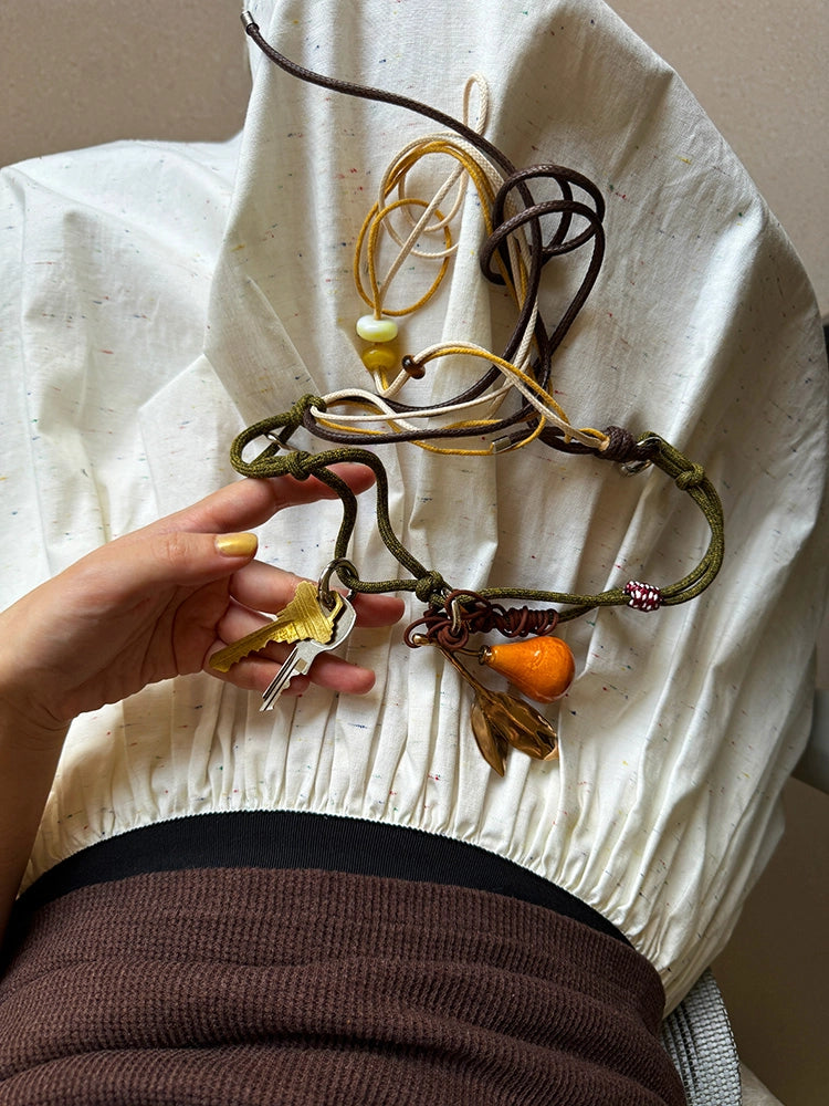 Fresh snow rests gently on a little red rooftop, while a spirited pup stands guard by your chest or waist. It sways softly with every step you take, like a quiet companion on your daily walks. Connected by sleek silver rings, the mixed braided ropes and polished natural stone beads add a touch of lively charm to a simple design.