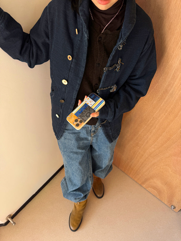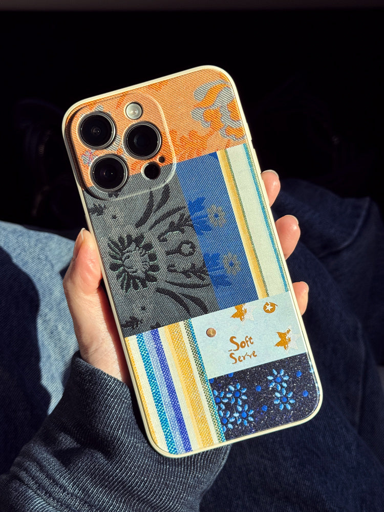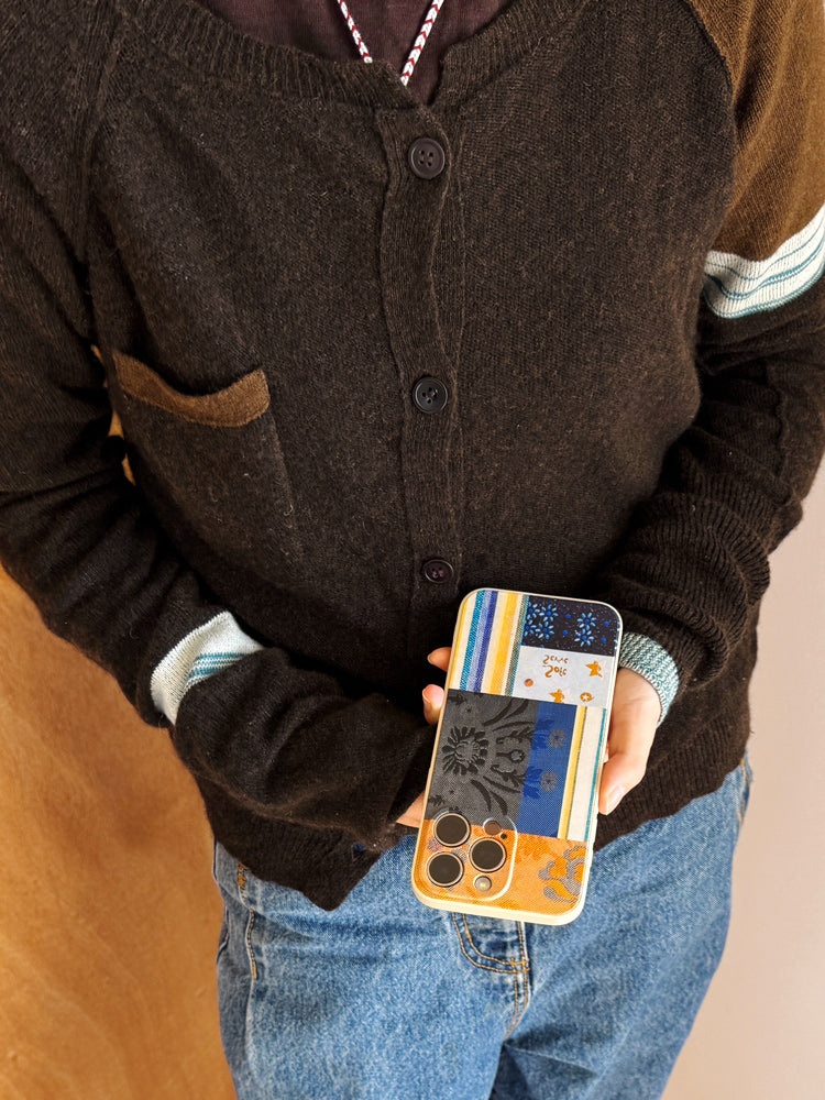 This case features collaged prints in mixed textures, plus a littlesparkle to layer onto your outfit.